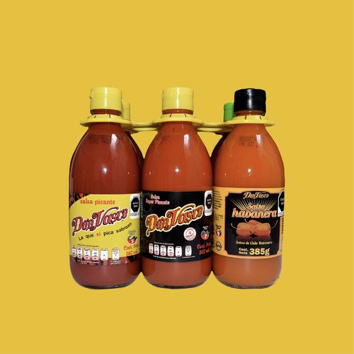 Six salsas en vidrio (2 Don Vasco, 1 E. Negra, 1 Chamoy, 1 Tarasca, 1 Habanero)